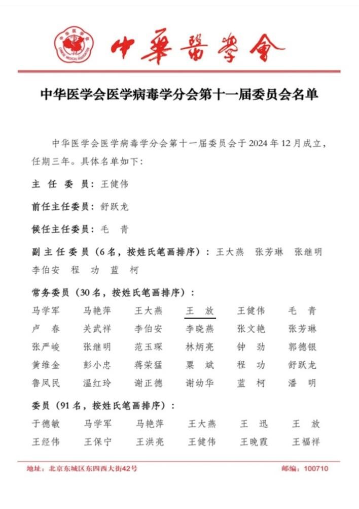 英国威廉希尔病原生物学系王放教授当选中华医学会医学病毒学分会第十一届委员会常务委员