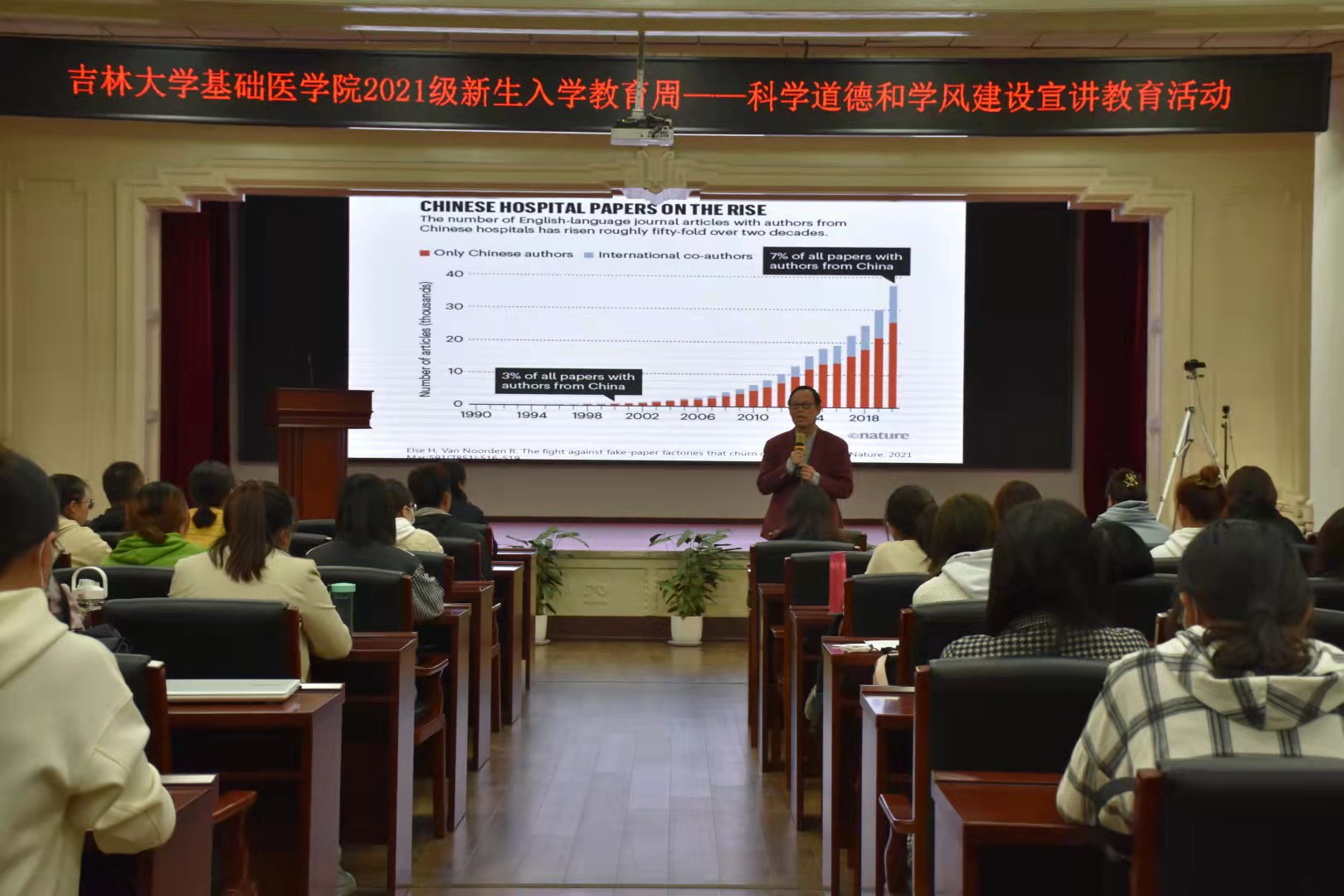 于永利教授针对近几年科研实践过程中引发的学术不端或学术不当的几个主要问题,逐一为同学们进行了讲解和阐述,为同学们敲响警钟。并以自身经历,鼓励大家在学习、生活中要不断超越自己。学会对未来作好规划,把握机会,保持积极向上的人生态度,做到自律、自信、自强。