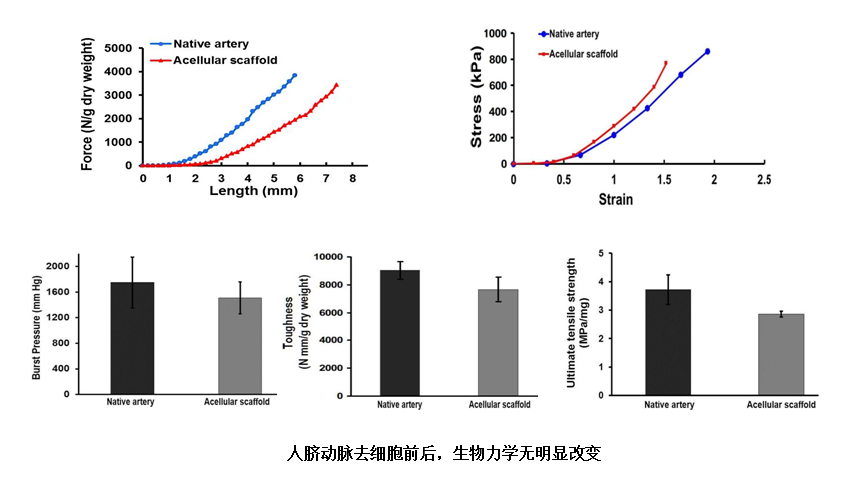 心血管栓塞常常引起心肌梗死、心肌纤维化和心功能失调,这不仅降低心血管患者的生命质量,还常常导致心血管疾病患者猝死。冠状动脉旁路移植(冠脉搭桥)是治疗以栓塞为主要病变的心血管疾病的首选方案,但常常因为缺乏有效、可供移植治疗的自体血管来源而举步维艰。人脐带来源丰富、获取方便。人脐带中含有两条脐动脉和一条脐静脉。采用特殊技术去除人脐带动脉内的细胞成份,保留其组织结构、管装构型、细胞外间质成份和生物力学特征,从而制备出去细胞脐动脉,是良好的制备组织工程小口径血管的支架材料。人毛囊不仅来源丰富、获取方便,而且含有多潜能干细胞,是重要的构建组织工程化器官的自体种子细胞来源。将人毛囊间充质干细胞体外分化为血管平滑肌细胞后,接种在去细胞人脐动脉血管支架上。人毛囊间充质干细胞来源的血管平滑肌细胞,不仅能够在去细胞脐动脉支架上增殖、迁移,还对氯化钾和去甲肾上腺素的刺激产生收缩反应,而且生物力学特征也与天然动脉血管相当。
