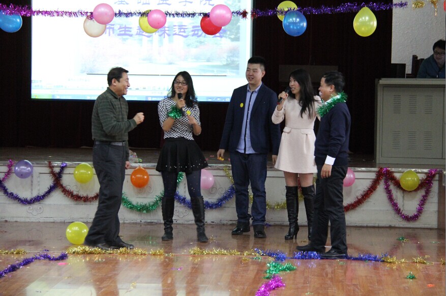运动会在研究生充满活力的“小苹果”和“兔子舞”中拉开帷幕。比赛共分为四个队,在欢快的音乐声中,院领导带头,老师和研究生积极踊跃上场,第一个比赛项目“跳单、双圈”瞬间将现场气氛推向高潮。紧接着拍球接力、螃蟹背西瓜、摸石过河,心有灵犀,穿衣接力等项目使现场氛围异常活跃。场上师生队员们相互支持、相互鼓励,紧密配合,全力争先,动感十足的音乐更激发了参赛队员奋勇拼搏的斗志。场下观众在教师领队和员工领队的带领下,呐喊助威,掌声、加油声、口号声不绝于耳。期间穿插的游戏“五毛一块”令师生爆笑连连,一首“勇敢”让演唱者演绎得精彩至极,主持人幽默诙谐的话语为比赛也增添了许多亮色。