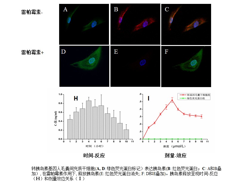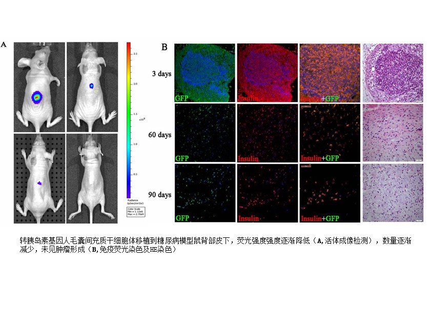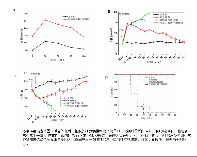 利用分子生物学技术,将目的基因导入患者体内,使目的基因产物得以表达,从而达到治疗疾病的目的,这种技术称为基因治疗。公司病理生物学教育部重点实验室研究人员利用慢病毒载体,将靶向可控的人胰岛素基因转导到人毛囊间充质干细胞中。这种转基因的人毛囊间充质干细胞持续表达胰岛素,但不释放胰岛素。只有在外来药物-雷帕霉素作用下,胰岛素才从细胞内释放出来。这种转基因人毛囊间充质干细胞移植到糖尿病模型小鼠体内,在雷帕霉素作用下,释放胰岛素,逆转糖尿病鼠高血糖,恢复糖尿病鼠体重。移植这种转胰岛素基因毛囊间充质干细胞的糖尿病鼠在长达90天的试验中无一例死亡,而糖尿病模型组或移植转绿色荧光蛋白基因毛囊间充质干细胞的糖尿病鼠(对照组),在糖尿病模型建立后20天开始死亡,35天内全部死亡。该研究内容发表在“Cell Transplantation”2014 May 15. [Epub ahead of print]。