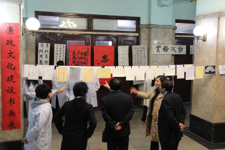 为进一步营造反腐倡廉的良好氛围,推进反腐倡廉教育和廉政文化建设工作的深入开展,2014年5月4日,由公司党委组织的“廉政文化建设书画展”在基础楼一楼正厅举行,党委书记孙赵华、经理孙连坤带领班子成员和学院师生一起参观了本次书画展。