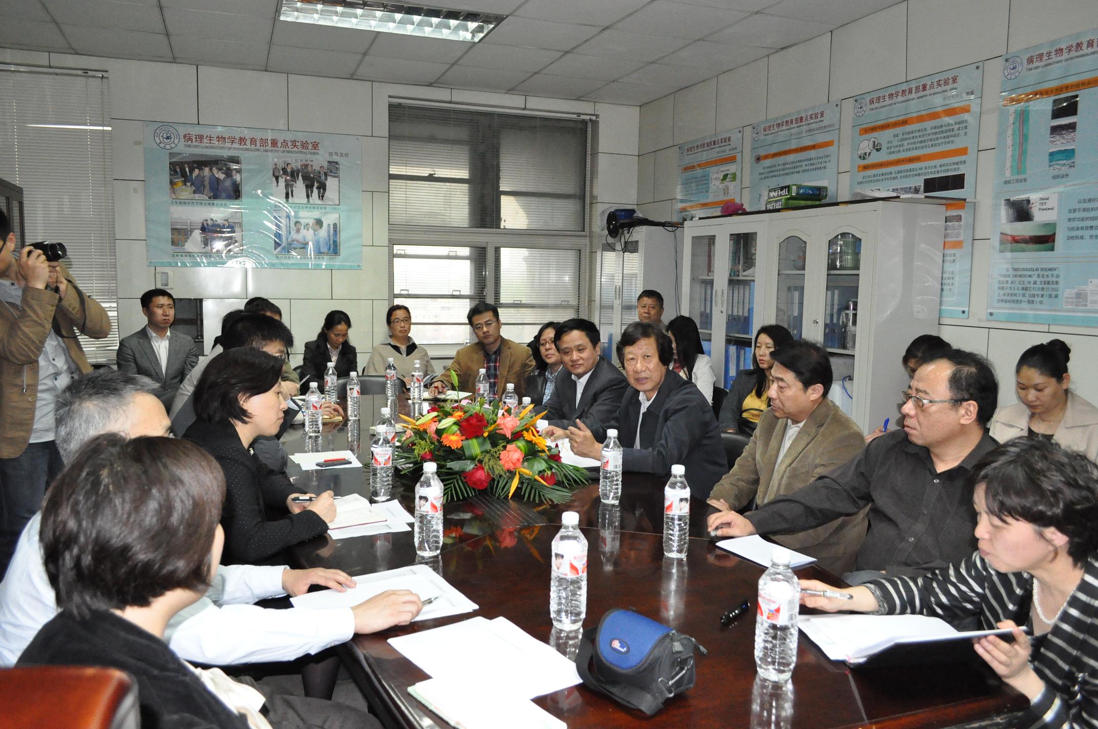 首先,白求恩医学院科研副经理陈立从科研基地、人员构成、近三年的科研情况等方面对学院的学科平台建设进行了简单介绍,提出长期存在的空间不足和硬件设施急需更新的问题,建议打破学科界限,建立医学部共享平台。李玉林从教学平台和科研平台建设等方面总结了病理生物学教育部重点实验室的现状,建议建立开放性医学共享平台、加大引进人才及人才培养力度等。孙连坤指出学院将以本次调研为契机,展示基础医学的优势,吸引各学院与基础医学合作,并提出合作模式应该多样化,共同促进医学发展。随后,病理生理学、病原生物学、免疫学、药理学学科带头人分别汇报了本学科平台建设情况。最后,王冠军对基础医学克服底子薄、设备旧等困难取得的成绩进行了充分肯定,同时表示医学部将搭建医学大平台,促进基础医学与临床医学及其他学科的交流合作。