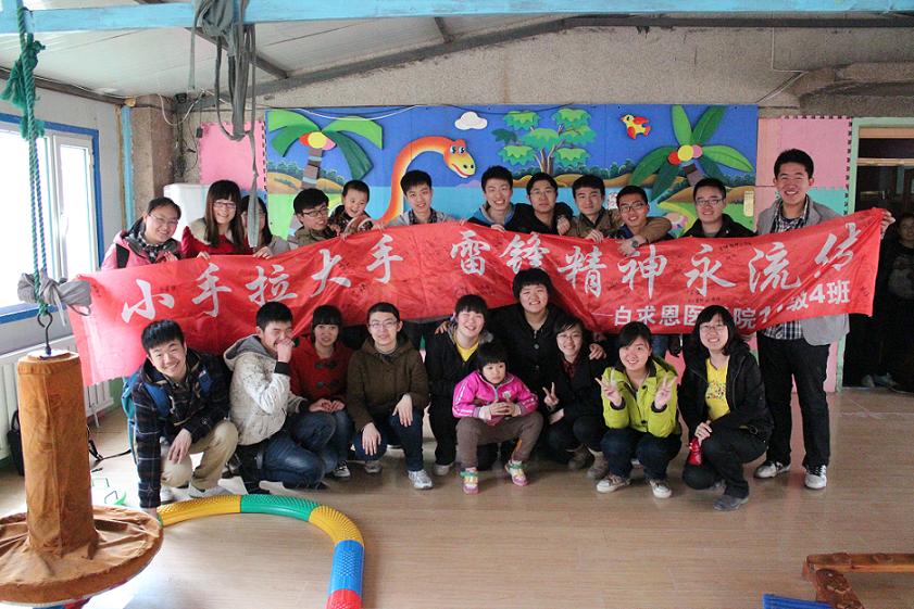 4月20日,701104班同学来到长春市宽城区育龙特殊儿童语言康复学校,走近自闭症儿童,帮助他们进行简单的日常自理行为训练,并用以清空零钱罐、收集废旧书籍纸张方式筹集的1000元爱心捐款为孩子们购买新桌椅。此外,701104班还在基础园区一公寓寝室楼下设立爱心捐助箱,收集同学旧衣物,并在雅安地震后将几百件衣物全部邮递给雅安市芦山县民政局,为灾区献一份爱心。
