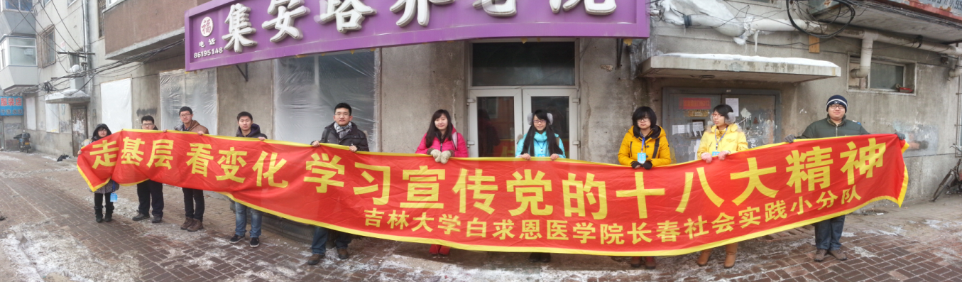 为了深入学习、贯彻党的十八大精神,增强员工的社会责任感和实践能力,白求恩医学院团委开展了2013年“走基层,看变化,学习宣传党的十八大精神”主题寒假社会实践活动,2013年1月20日,白求恩医学院医疗服务小分队开展了主题为“弘扬雷锋精神,爱心服务吉林”的社会实践活动。