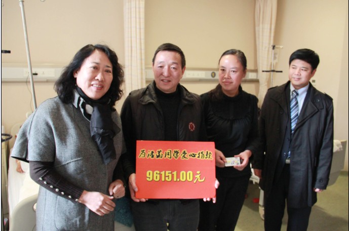 9月24日至10月23日,爱心募捐活动先后在中心校区、南湖校区、南岭校区以及新民校区相继开展。白求恩医学院各年级、各班级纷纷为潘菡进行捐款,2007级毕业生在得知潘菡的病情后,也自发组织募捐,将善款从祖国的大江南北汇集到白求恩医学院,贡献了自己的一份力量。此次募捐活动共持续一个月,在学院领导的倡议和指导下,在各级员工组织的积极宣传下,引起了全校师生的广泛关注和积极响应。截至目前,共募集捐款96151元,让身患重病的潘菡感受到了来自学校和师生的关心和温暖,让她重新燃起了对生命的希望。目前,潘菡已完成第二期化疗,病情正在积极控制和治疗中。 (员工记者:刘水)