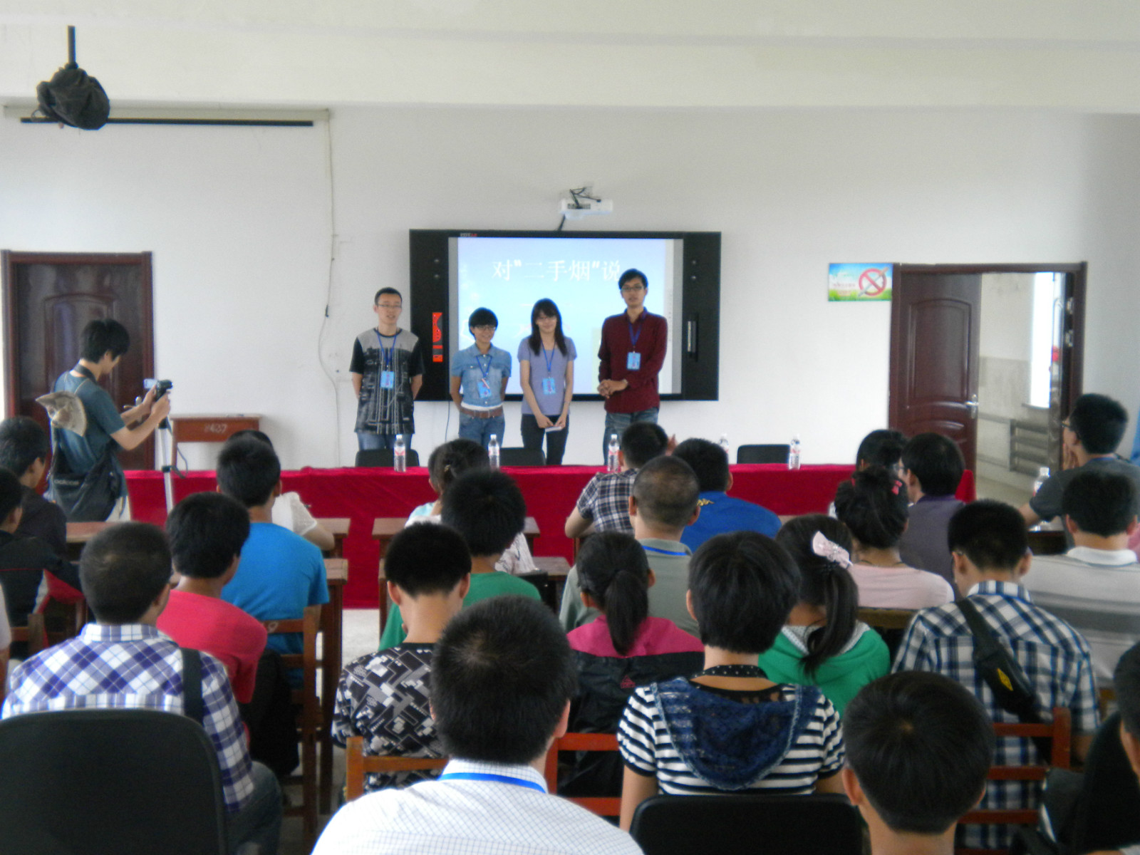 8月9日,师生一行来到杨木林镇中学,为这里的中员工们做二手烟防治的宣讲,四名主讲同学用精心准备的ppt为中员工们生动的讲解了什么是二手烟、二手烟的危害、如何防范二手烟,并在现场做了有奖征答的互动环节,宣讲结束后,老员工同学们走到中员工同学们中间,在三高防治、学习、生活等方面做了相互交流。