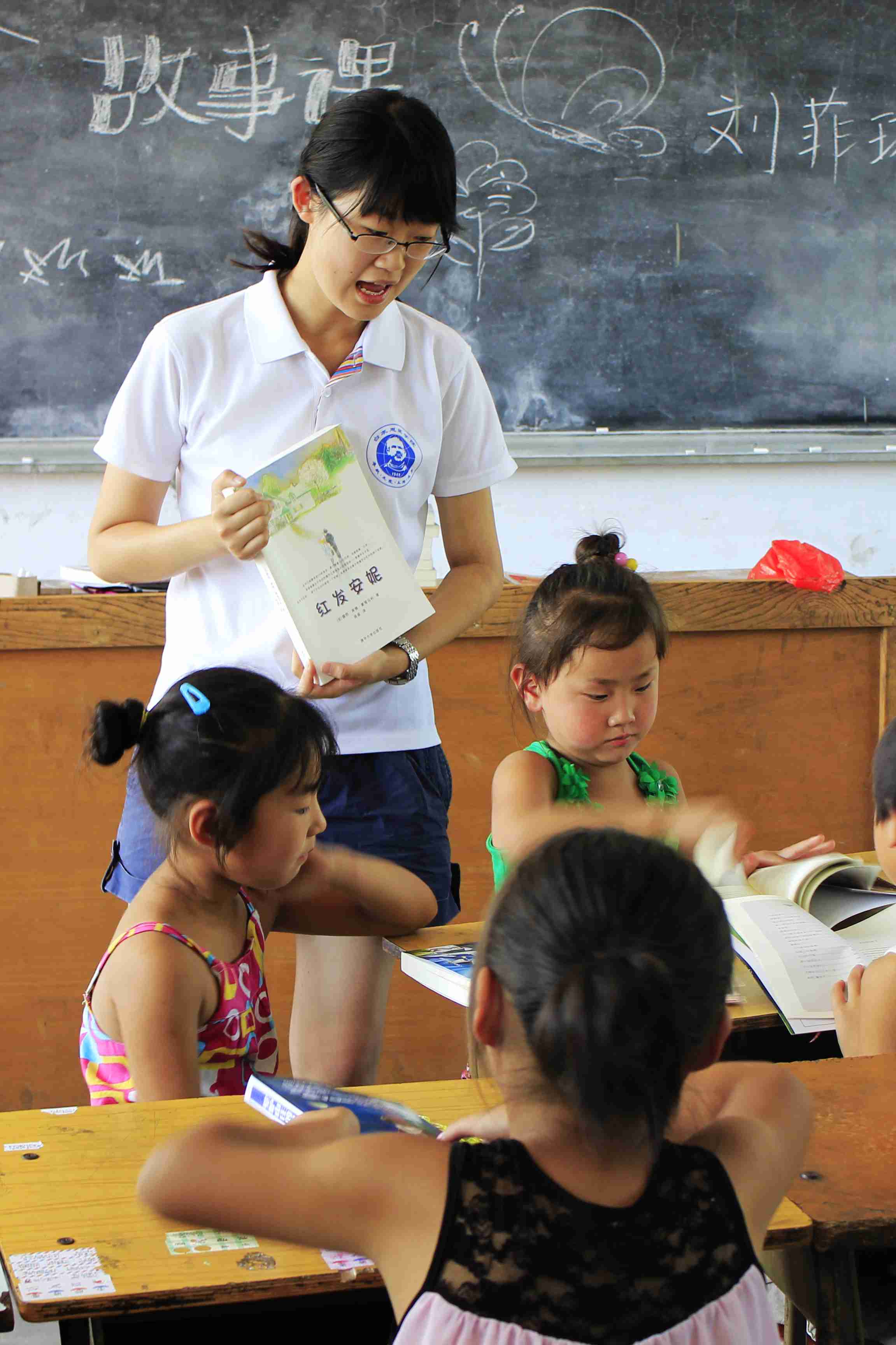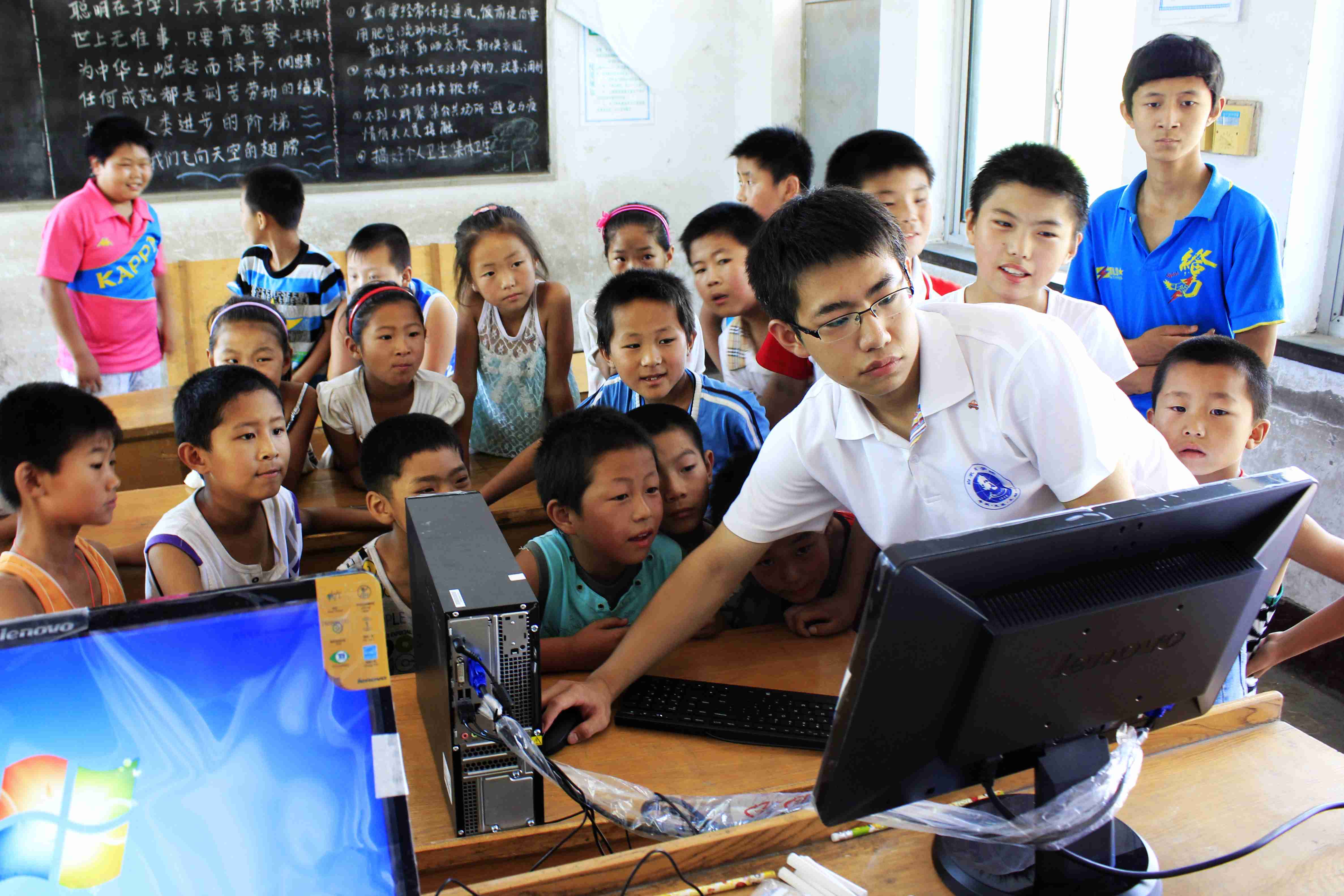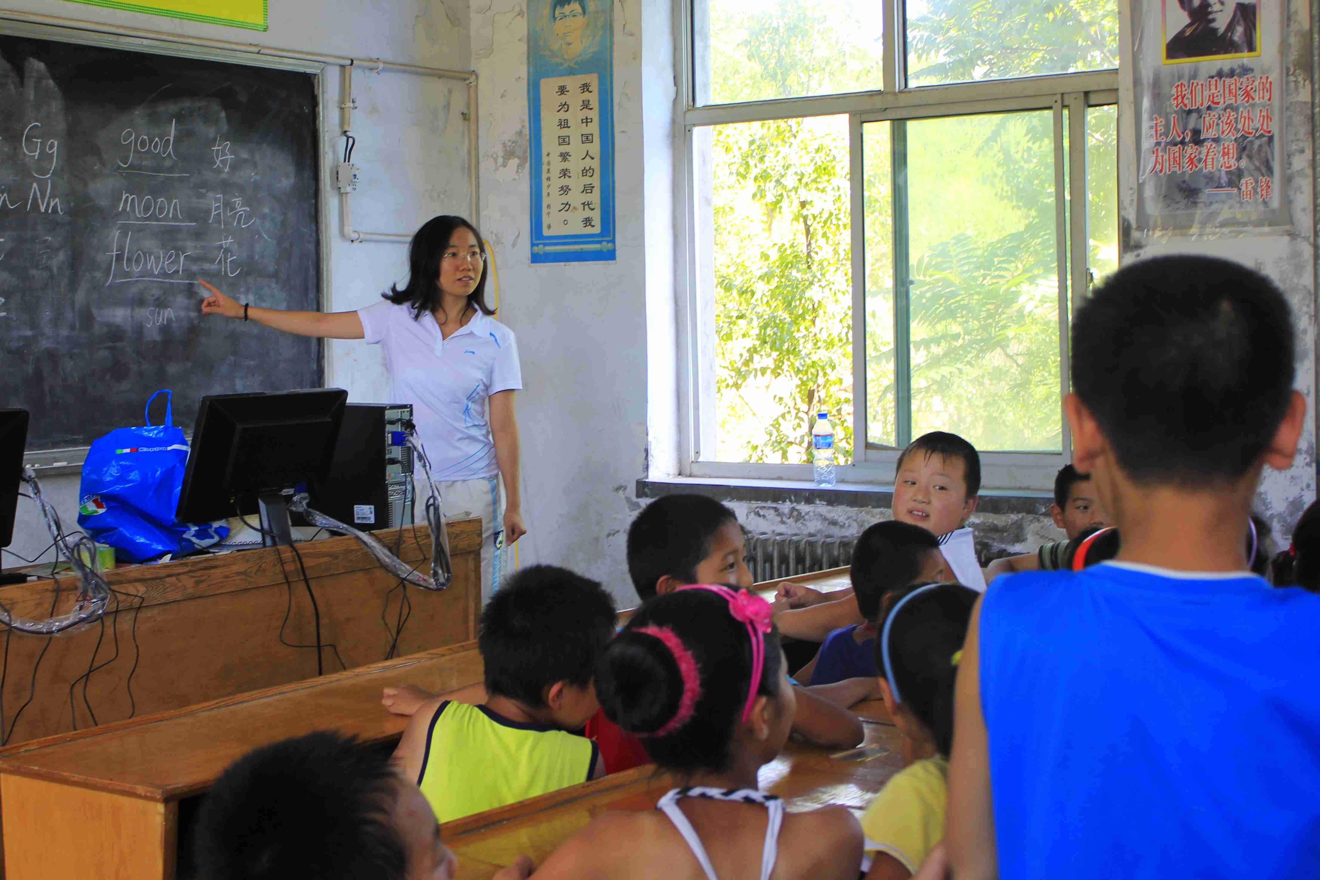 回到小学,孩子们已经带着纸笔在等待着我们上课。很快地,两个教室便坐满了孩子。张颖异给幼儿班及一年级的孩子上英语课,还准备了精美的贺卡作为礼物。这个班的孩子年龄都很小,很多连自己的名字都不会写,26个英文字母更认不全。但是他们上课非常认真,也积极地回答问题。在张颖异的认真引导启发下,短暂的一节课后,他们就能熟练的读出所有的字母。同时,在另一件教室里王子鸣给二年级的孩子上了一节电脑课。因为信息闭塞,很多孩子都没碰过电脑,他们好奇地看着老师在电脑上进行的每一步操作,并不时发出惊叹的声音。孩子们那种对外界环境和新鲜事物的好奇及渴望,让队友们真切地感受到要在接下来的几天中,尽可能的拓展他们的视野,带给他们走出去的希望。体育课上,周明铭带着孩子们打了一场痛快淋漓的球赛,一边打,周明铭还一边耐心地讲解篮球赛的规则,帮助孩子们更规范的从事体育运动。下午,刘悦娇上了一节有趣的美术课,刘菲琳则生动的给孩子们讲故事,任景炎在作文课上以“我的好朋友”为主题,教孩子们怎样描述人物,李腾海更是在音乐课上教孩子们演唱《中国少年先锋队队歌》。烈日照耀下的校园,充满了勃勃生机与希望。就在学校快要放学时,有一个叫甄一达的孩子有些中暑,头晕,我们的队友任景炎担心他摔倒,一直背着他下楼,,还把他带到了我们队员的房间,等他身体舒服了,任景炎还是不放心,就一直把他送回家。