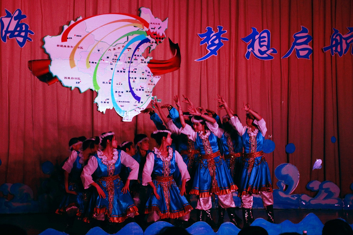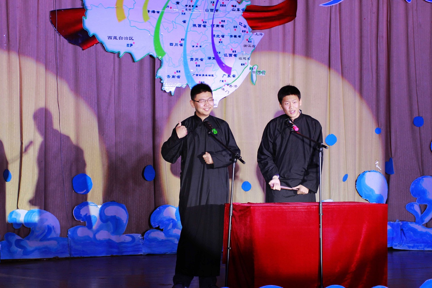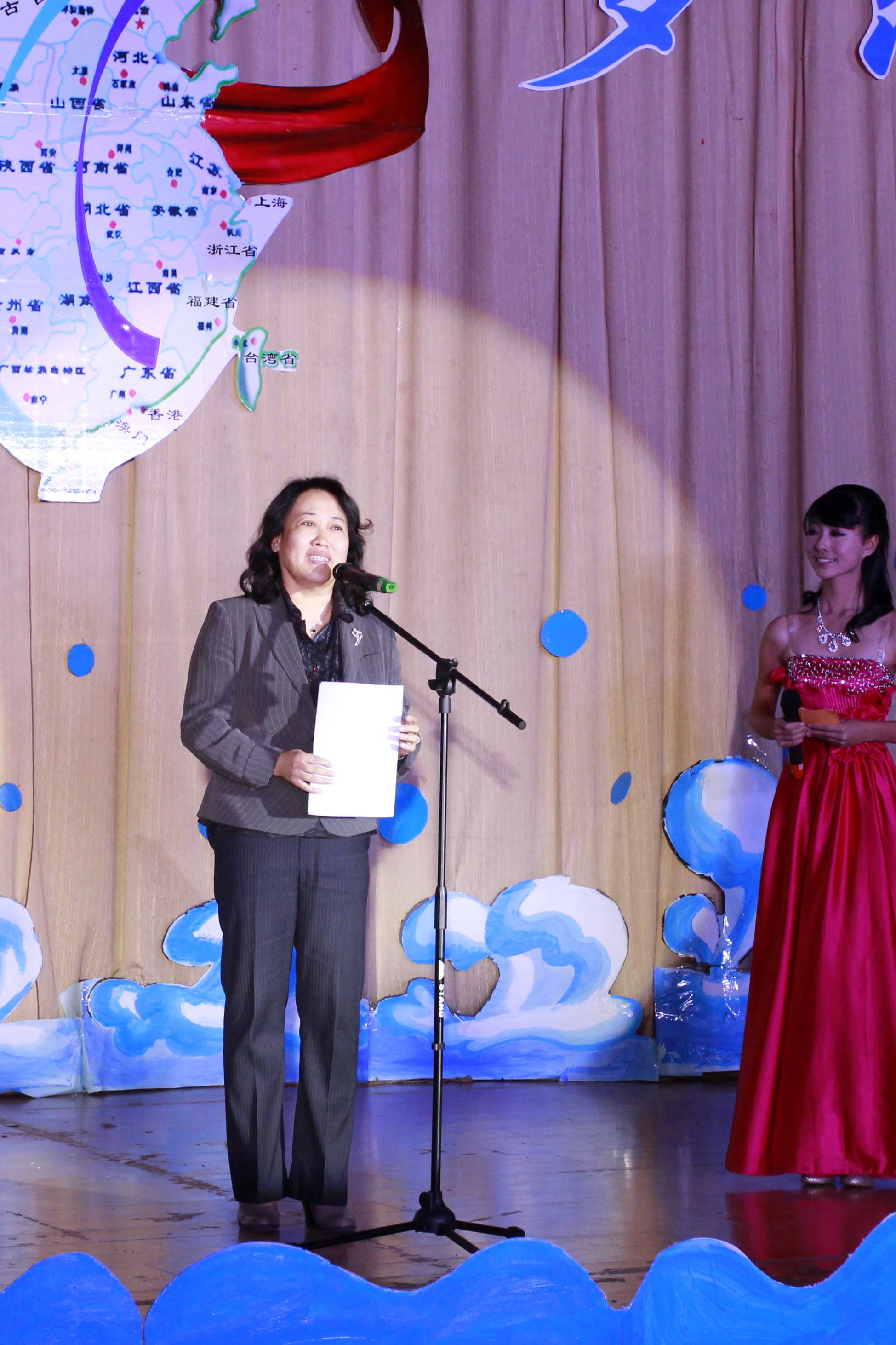 当一记鼓声响起,打破了全场的企盼与期待,身着炫丽服装的演员们以开场舞《鼓舞青春》拉开了整场晚会的序幕。接下来,进行了2011级班主任献花仪式,由员工代表向各班班主任献花,表达他们对老师的感激与敬意。随后,伴着悠长的音乐,蒙古歌舞《鸿雁》向观众们展现了大草原的别样风光。而同学们自编自演的相声《大学初体验》,更是凭其幽默的表演引得全场掌声连连、笑声不断。以老员工学习生活为主题的《光影秀》让人眼前一亮,《新版浏阳河》令人耳目一新,新疆舞蹈博得全场的掌声和喝彩。精彩的表演将晚会一次次的推向高潮。最后由来自2008级的全体辅导员助理们合唱的《相亲相爱》更是带动了全场的气氛,为本次晚会画上了一个完美的句号。晚会在和谐欢快的气氛中圆满落下帷幕。