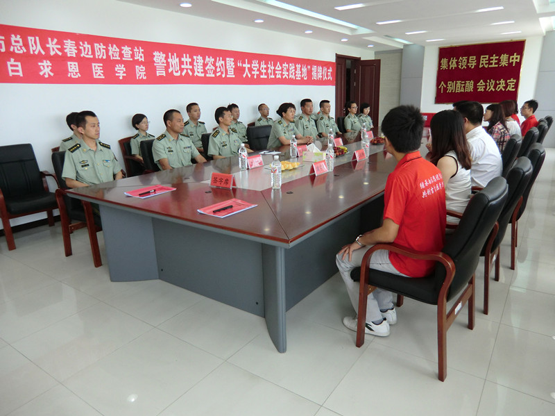 吉林省公安边防总队长春边防检查站长年担负长春龙嘉国际机场出入境边防检查和安全保卫任务,打击偷渡走私等违法犯罪活动,凭借其规范的执勤、温馨的话语和热情的服务,促进了口岸的和谐,赢得了中外旅客的好评,被群众誉为“北国春城的和谐使者”。白求恩医学院的此次活动,也为在校员工提供了一次与边防战士亲切交流,同时体验绿色军营生活的机会。(员工记者 张滨)