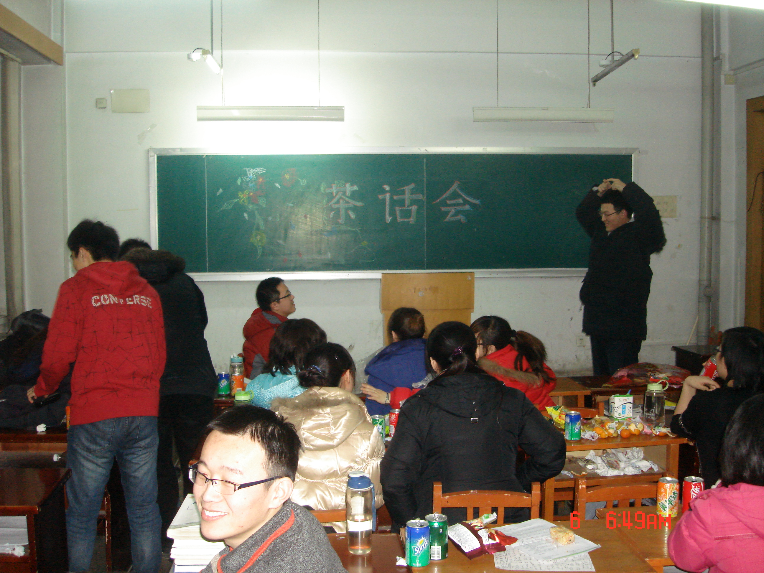 茶话会上,每位同学都畅所欲言,对自己在2010年的表现进行总结、对2011年进行憧憬,内容涉及学习、生活等各个方面。孙连坤教授结合员工们的发言谈了几点建议:一是,不要只看到学习生活中的琐碎小事,要有远大理想,心胸要开阔,展现白医人的风采;二是,注重外语的学习,切切实实把它作为工具来使用,不把眼光仅仅局限于过六级上;三是,珍惜同学之间的友情,珍惜自己所在的班级,共同努力,共同进步;四,培养自己的应变能力、决策能力,使自己成为具有领导能力的人才;五是,2011年春季学期开学后,班级内部进行讲课训练,为以后求职打基础。最后,同学们一同玩起了“成语猜猜看”的游戏。
